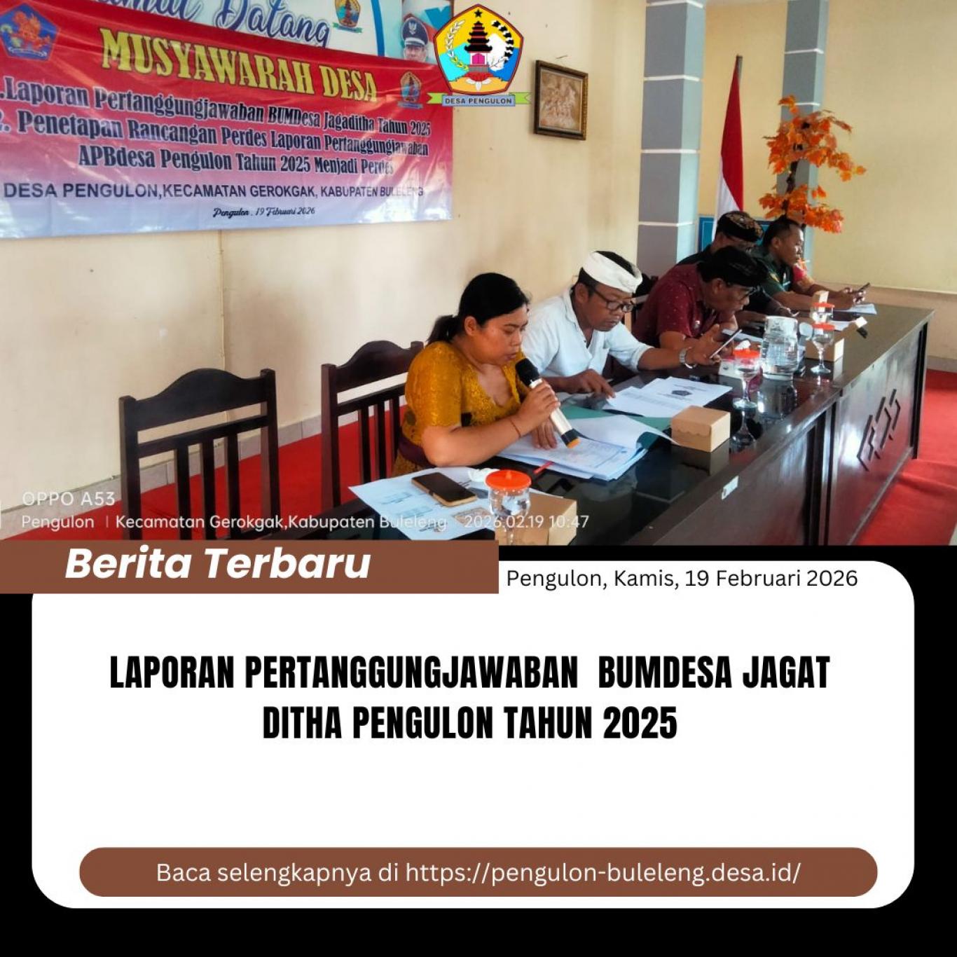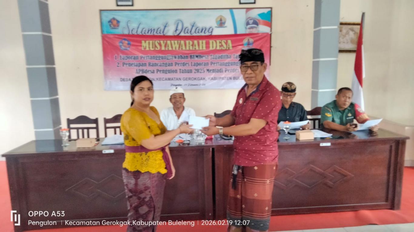 Musyawarah Desa laporan pertanggung jawaban BUMDesa Jagaditha Pengulon, Kecamatan Gerokgak, Kabupaten Buleleng, Provinsi Bali dilaksanakan pada hari Kamis (19/02/2026). Dalam kesempatan ini Perbekel Pengulon menghadiri acara Pertanggungjawaban  BUMDesa Jagaditha Pengulon Tahun 2025 bertempat di Ruang Rapat Kantor Perbekel Pengulon.