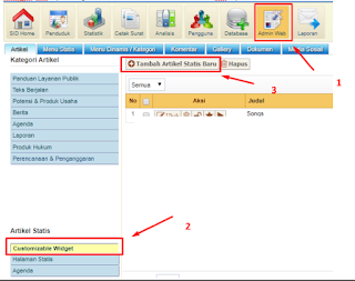 Lalu login ke website desa dan masuk/klik pada Admin Web (No. 1) pilih Customizable Widget (No. 2) terus pilih Tambah Artikel Statis Baru (No. 3)