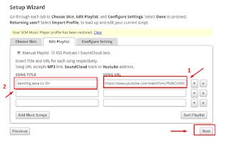 Akan muncul tampilan seperti ini, masukkan alamat yang sudah dicopy tadi (Ctrl+v) pada kolom nomor 1 dan kolom nomor 2 untuk judul lagu tersebut (lihat gambar). Jika ingin menambahkan lagi lagu masukkan alamat lagu lain seperti cara sebelumnya di kolom di bawahnya. Dan klik next