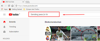 Lansung saja pada tutorialnya da bila gambar kurang jelas bisa didownload pada akhir artikel, sebagai contoh kita akan mencari lagu gending Jawa yang berjudul “Gending Jawa Lir Ilir” (ini sekedar contoh), kunjungi situs YOUTUBE (bisa langsung klik tulisan "youtube" tersebut) ketik pada kolom pencarian, lalu enter