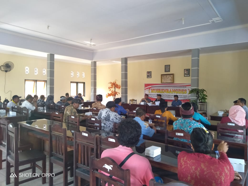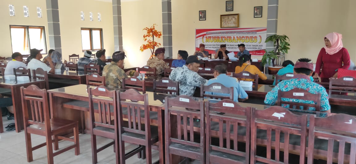 Pengulon - Kamis, 19 September 2019, pukul 09.00 wita, yang bertempat di Ruang Rapat Kantor Perbekel Pengulon. Acara Musrenbangdes Rencana Kerja Pemerintah Desa ( RKPDesa )Tahun 2020. Musrenbangdes adalah Forum Musyawarah Desa Tahunan untuk menyepakati Rencana Kerja Pembangunan Desa (RKP) tahun anggaran yang direncanakan. Tujuan Musrenbang Desa: 1. Menyusun prioritas kebutuhan/masalah yang akan dijadikan kegiatan untuk penyusunan RKP Desa dengan pemilahan Sebagai Berikut Prioritas kegiatan desa yang akan dilaksanakan desa sendiri dan dibiayai oleh APB Desa yang bersumber dari Pendapatan Asli Desa (PA Desa), Alokasi Dana Desa (ADD), dana swadaya desa/masyarakat, dan sumber lain yang tidak mengikat, dan Prioritas kegiatan desa yang akan dilaksanakan desa sendiri yang dibiayai oleh APBD Kabupaten/kota, APBD Propinsi, APBN. 2. Menyiapkan prioritas masalah daerah yang ada di desa yang akan diusulkan melalui MUSRENBANG Kecamatan untuk menjadi kegiatan pemerintah daerah. 3. Menyepakati Tim Delegasi Desa yang akan memaparkan persoalan daerah yang ada di Desanya pada forum MUSRENBANG Kecamatan untuk penyusunan program pemerintah daerah tahun berikutnya. Dalam Acara Musrenbangdes Yang langsung di hadiri Bapak Camat Gerokgak, Pendamping Desa Kec. Gerokgak, Ketua BPD dan Anggota, Perbekel Pengulon,Perangkat Desa Pengulon, Kelian Desa Pakraman Pengulon dan Prajuru, Ketua LPM dan Anggota, Kelian subak Pengulon dan Subak Abian Merta Sari, Ketua Tim Penggerak PKK dan Anggota, Kepala TK Gayatri Kumara, Ketua Karang Taruna dan Anggota, Tokoh Masyarakat, Masyarakat Miskin ( Perwakilan ), Kelompok Nelayan, Kelompok Wanita Tani, Kelompok Usaha Bersama.