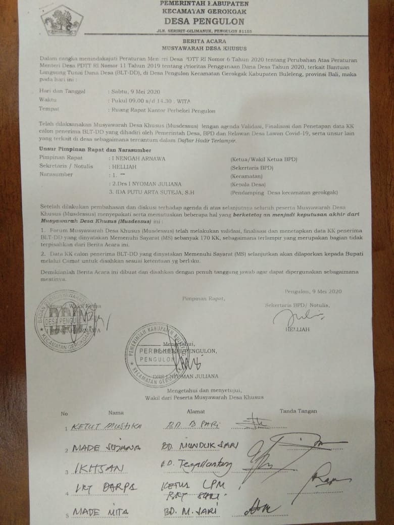 Mengigat sudah selesainya Kegiatan validasi Calon Penerima BLT selama Enam hari, Kamis s/d Senin, Tanggal 29 April s/d 04 Mei 2020. Maka Pemerintahan Desa Pengulon Bersama BPD serta, Tim Relawan Covid-19 Desa Pengulon, Melaksanakan Musyawarah Desa khusus penetapan Daftar Nama Calon Penerima BLT Dana Desa di Desa Pengulon Tahun 2020 dan memvalidasi Data Calon Penerima BLT (Sabtu, 09 Mei 2020 ). Desa  Pengulon mencari 170 KK Penerima BLT Dana Desa. Tentunya dalam penentuan ini tetap mengacu atau berpedoman Surat Edaran Bupati Buleleng Nomor 140/277/SE/DPMD/2020 tanggal 21 April 2020 tentang Pelaksanaan Bantuan Langsung Tunai Dana Desa, Serta penentuan tersebut juga berpedoman dengan Surat Direktur Jendral Pembangunan Daerah Tertinggal dan Transmigrasi RI Nomor 10/PRI.00/OIV/2020 tanggal 21 April 2020 perihal Penegasan Petunjuk Teknis Pendataan Keluarga Calon Penerima BLT Dana Desa. Dalam pelaksanaan Musyawarah Desa khusus yang di selenggarakan oleh Badan Permusyawaratan Desa ( BPD ) untuk pengesahan atau Penetapan data Keluarga Penerima BLT Dana Desa yang ada, bersama Perbekel Desa Pengulon, Dengan Di dampingi oleh Pendamping desa, dan turut hadir Bapak Camat Gerokgak Tim Relawan Covid-19 Desa Pengulon, Kelian Desa Adat dan Prajuru, Ketua Bumdes Jgadhita, Ketua Karang Taruna, Ketua LPM, Ketua TP-PKK Desa Pengulon, Tokoh Masyarakat, Tokoh Agama, Babinsa, dan babinkamtibmas Desa Pengulon, menetapkan dan mengesahkan Data Keluarga Penerima BLT Dana Desa yang berjumlah 170 KK. Sebagai Transparansi Pemerintah Desa Pengulon bersama BPD dalam menentukan Data keluarga Penerima BLT Dana Desa ini, maka kami telah lampirkan Data Lengkap Keluarga penerimanya berserta Berita Acara Musyawarah Desa yang telah terlaksana dan juga kami telah membagikan frint out nya ke masing Kelian Banjar Dinas agar bisa di informasikan ke warga masyarakat khususnya warga Desa Pengulon.
